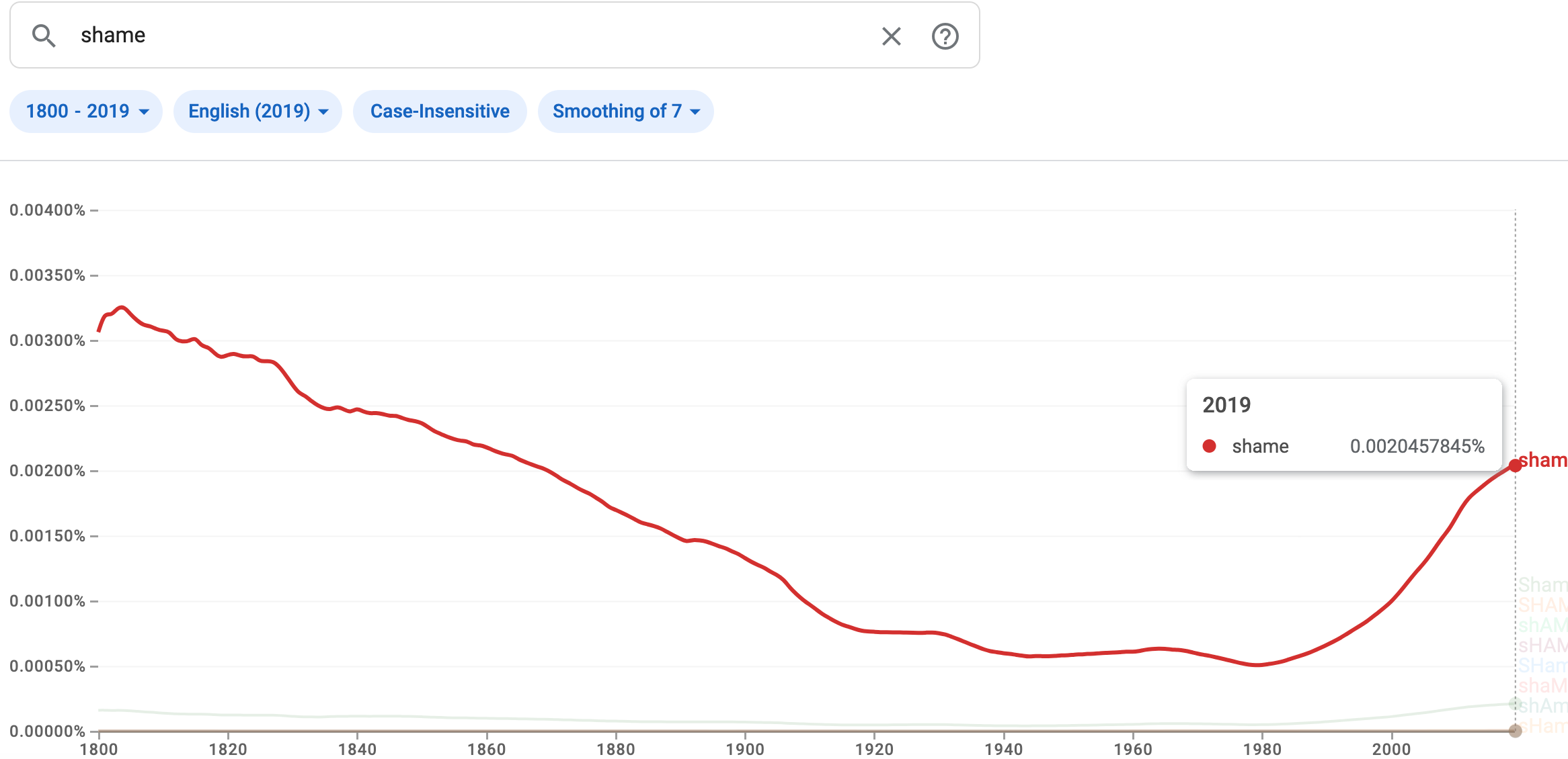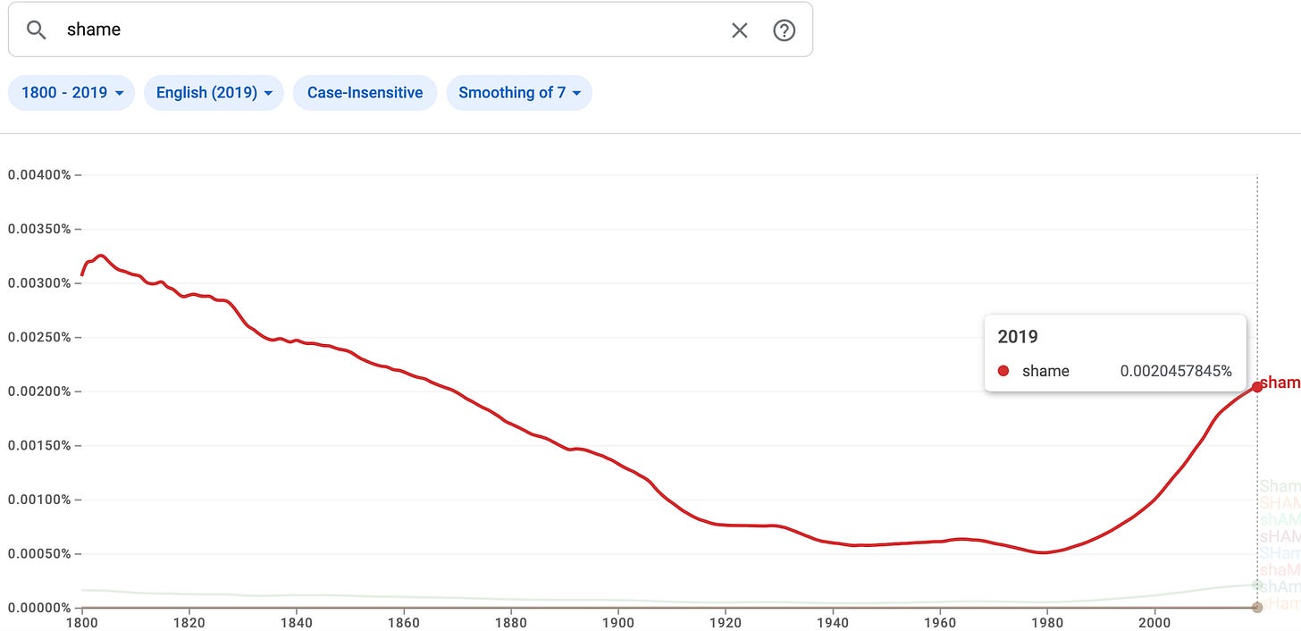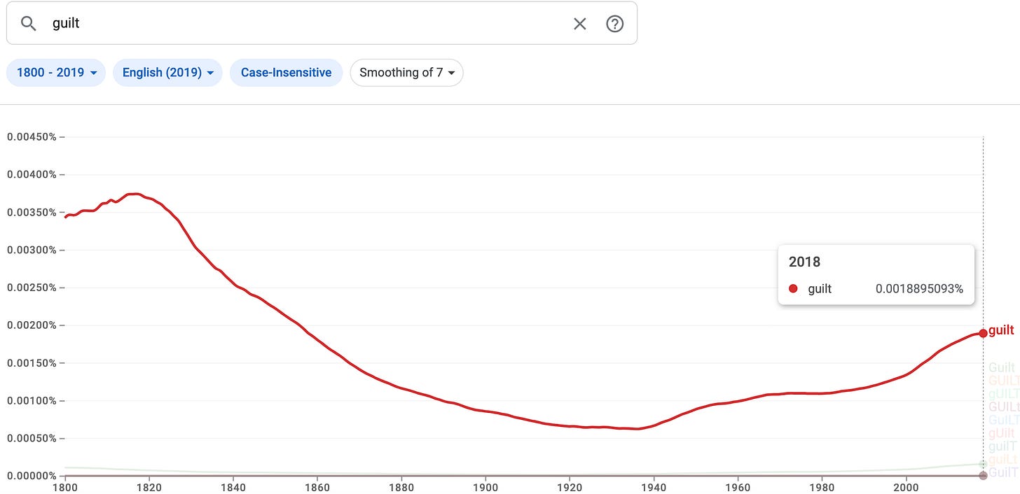 In taking the above action, I found something terribly interesting. There are charts online that will show the prevalence of word use over time. Look at the charts below, and notice since about 1990 the difference in the rate of change between the use of guilt vs. shame. Shame is kicking ass while guilt has a seemingly gentler rise. Both trends are somewhat confusing and concerning, and I offer no conclusions other than to ask you to stop and think about how you view regretful actions. Do you log them as a mistake, make amends and move forward? Or, do you log them as another proof positive that you are a terrible person?